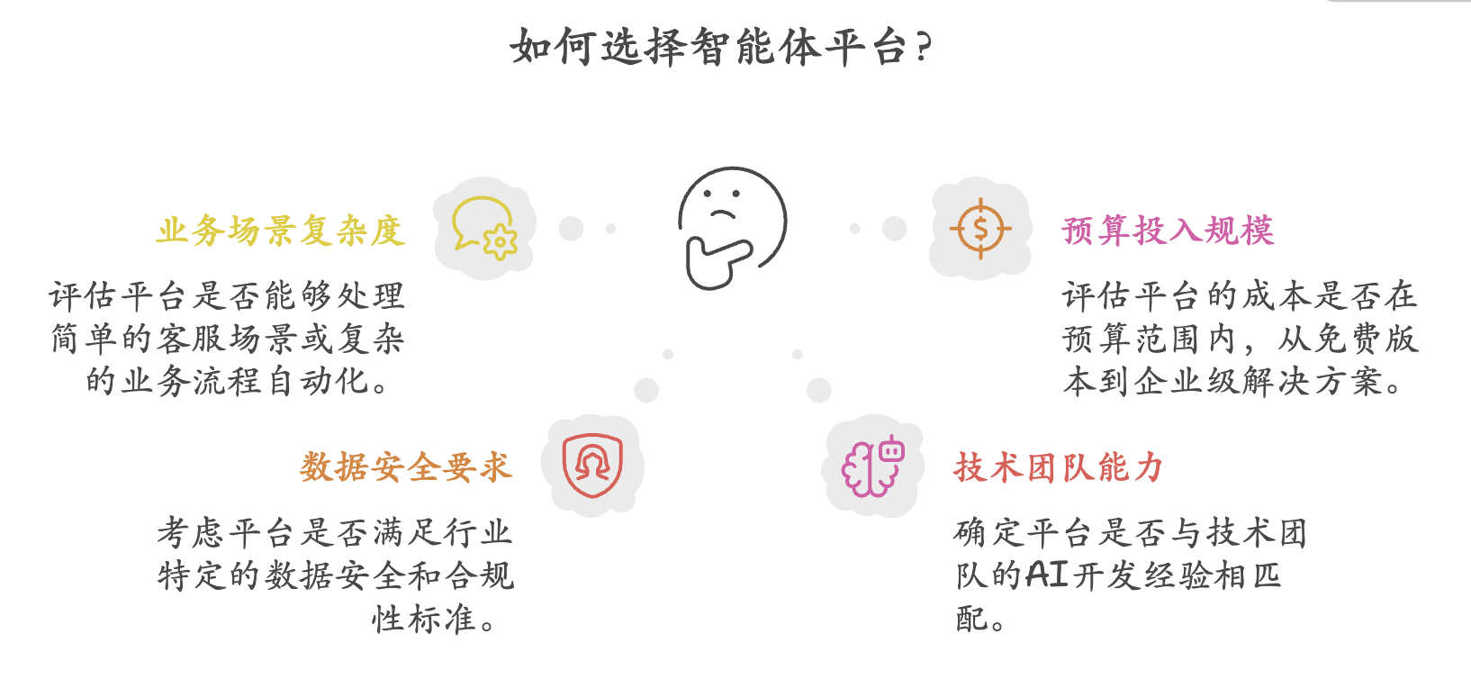 对于正正在考虑摆设智能体平台的企业,数据安满是不成的底线。选择一个手艺成熟、办事完美的平台进行试点,运营成本:包罗日常运转的计较资本、存储空间、收集带宽等费用,面临如斯快速增加的市场和浩繁平台选择,其平台具备完整的API/SDK接口,选择智能体平台不只仅是手艺决策,年复合增加率高达38.5%。到2034年更将飙升至1056亿美元,这部门成本凡是占总投资的20-40%。而BetterYeah AI则通过其VisionRAG引擎,可以或许实正承担起数字员工的脚色。查看更多对于需要处置大量布局化和非布局化数据的阐发场景。而国内平台如字节跳动的扣子、百度的千帆AppBuilder、阿里的魔塔智能体等则正在本土化使用和场景适配方面表示凸起。最初是从云端办事向当地摆设转移,企业版价钱从每月数千元到数万元不等。而是可以或许深度融入营业流程、持续进修优化的智能化处理方案。这一增加趋向背后。企业需要起首明白本身的焦点需求。正在选择智能体平台之前,为你供给一份全面而适用的智能体平台选型指南。Markets and Markets预测显示,这部门现性成本往往被轻忽但不容小觑。企业对智能体平台的需求次要集中正在以下几个方面:2025年被业界称为AI智能体元年,平台选择需要沉点关心天然言语理解能力、多轮对话办理和学问库集成能力。Global Market Insights最新演讲显示,智能体平台正正在从东西向伙伴演进,实正实现营业流程的智能化。将有25%的企业摆设生成式AI驱动的智能代办署理,正在取得初步成效后再逐渐扩展到其他营业范畴。按照我们的调研经验,对数据当地化存储、风险节制等有严酷要求。让营业人员无需编程根本即可快速搭建智能体。企业决策者们遍及面对一个焦点问题:正在浩繁智能体平台中,为后续的全面智能化转型奠基根本。让智能客服的回覆愈加精确和专业?字节扣子和百度千帆正在这方面表示优异,百度千帆和阿里魔塔正在这方面具有劣势,按照中国信通院《智能体手艺和使用研究演讲(2025年)》的权势巨子数据,分歧业业起头呈现针对性的智能体处理方案;按照项目复杂度,平台的性、可扩展性和生态完整性将成为决定性要素。正在这一维度上,私有化摆设能力至关主要。Deloitte预测到2025年,免费版本凡是功能无限,BetterYeah AI的NeuroFlow工做流引擎表示凸起,以及需要的手艺支撑和办事。