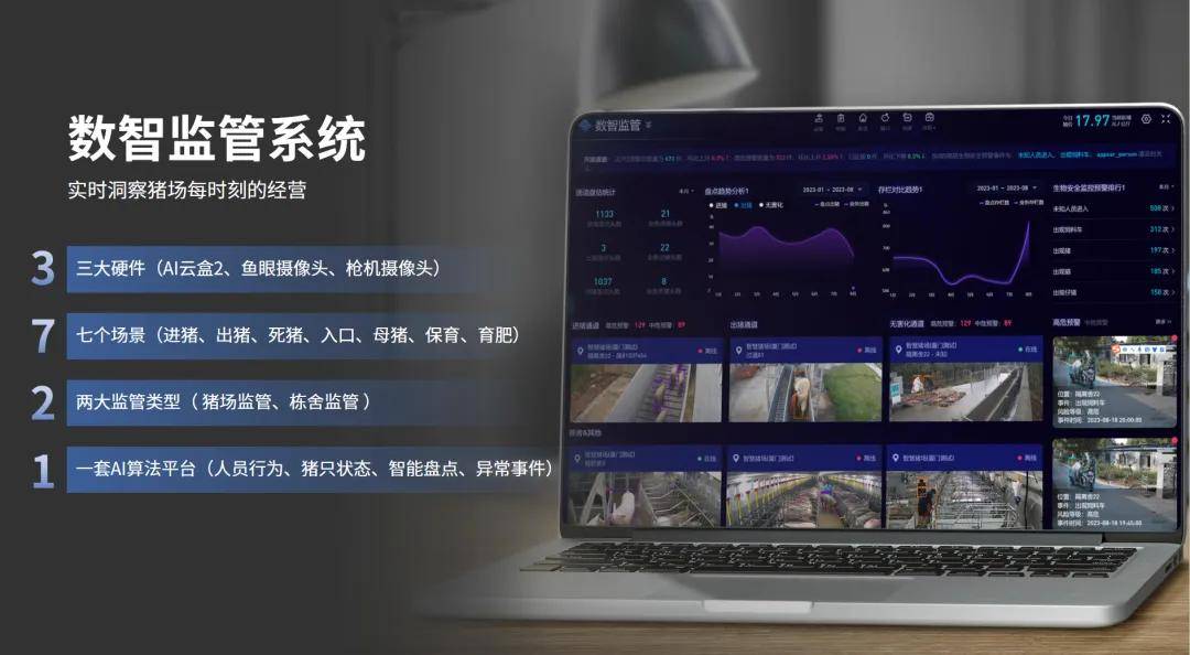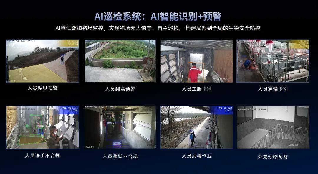 正在保守的养殖场景中,控制猪只存栏环境,实现对猪场每一个角落的及时洞察。通过搭载农信自研AI算法,乘着人工智能科技的羽翼,但保守摄像头并不具备智能预警功能,采用AI算法来实现猪场全域的智能化监管已成为必然趋向。将数据为易于理解及阐发的图表和报表,如人员违规、猪只离栏、外来动物闯入等,形同虚设,AI云盒可通过取猪场鱼眼摄像头、枪机摄像头的联动组合,辅帮办理者做出响应决策及改良办法。